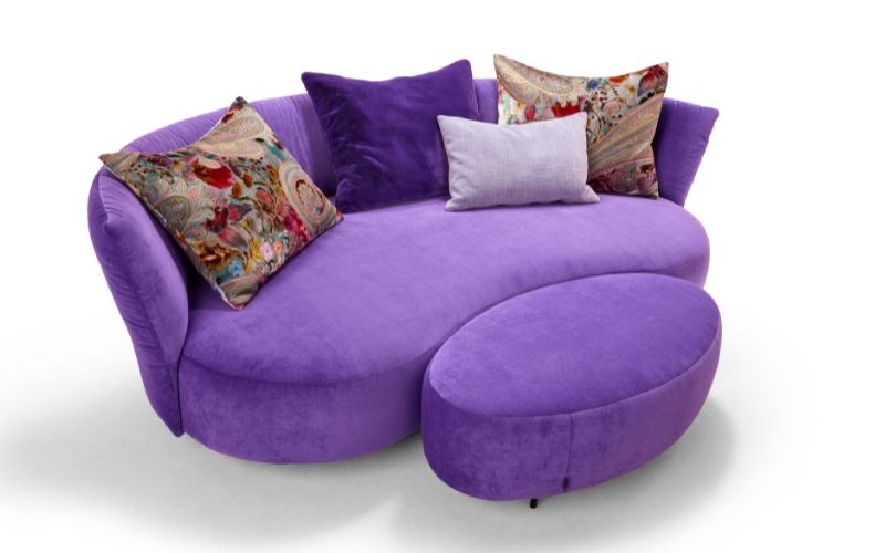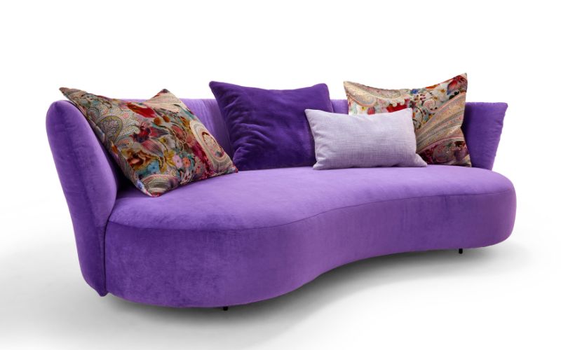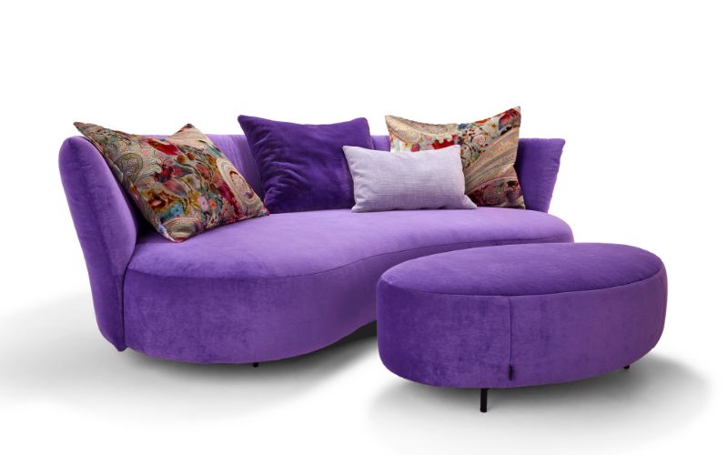 Sofa SOFIA, aus der aktuellen Bullfrog Kollektion. Schöne organische Form mit einem besonderem Sitzerlebnis. Geeignet als Raumteiler oder freistehend zu platzieren. Bezogen in einem modischen Samtbezug mit sehr hoher Abriebfestigkeit, Farbton purple. BHT ca. 250/79/130 cm. Kissen sind nicht im Preis enthalten und werden separat und individuell, nach Form, Größe und Bezug berechnet. Der passende Hocker ist nicht Teil des Angebotes und wird separat berechnet.