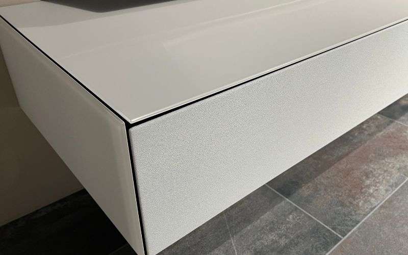 Stoffklappe in silber. Lowboard in Glas hellgrau matt Incl. LED Spots. Ohne Deko und TV.